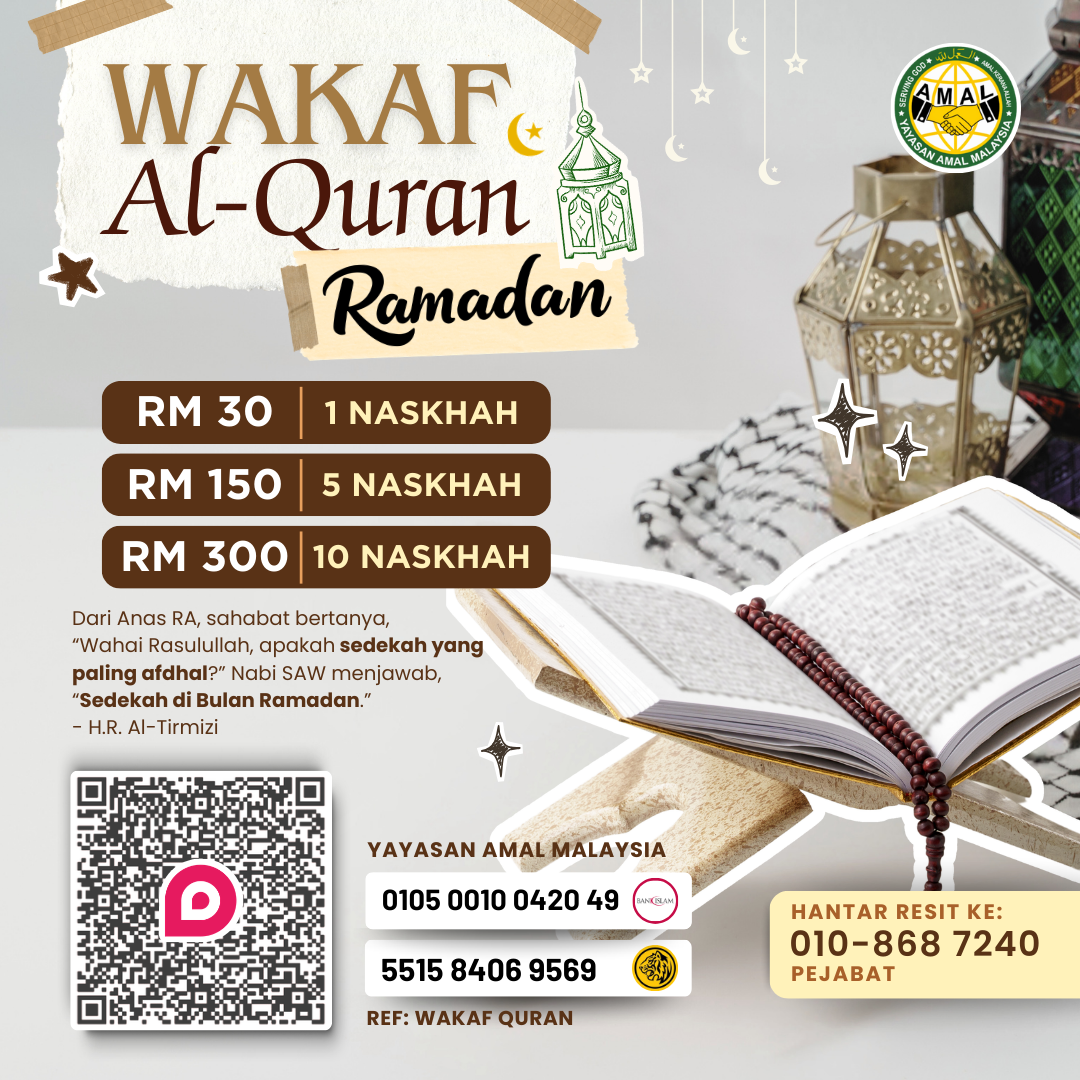 Dengan wakaf serendah RM 30, anda dapat membantu menyebarkan cahaya kepada mereka. Setiap ayat yang dibaca daripada naskhah yang anda wakafkan akan menjadi amal jariah yang berterusan.